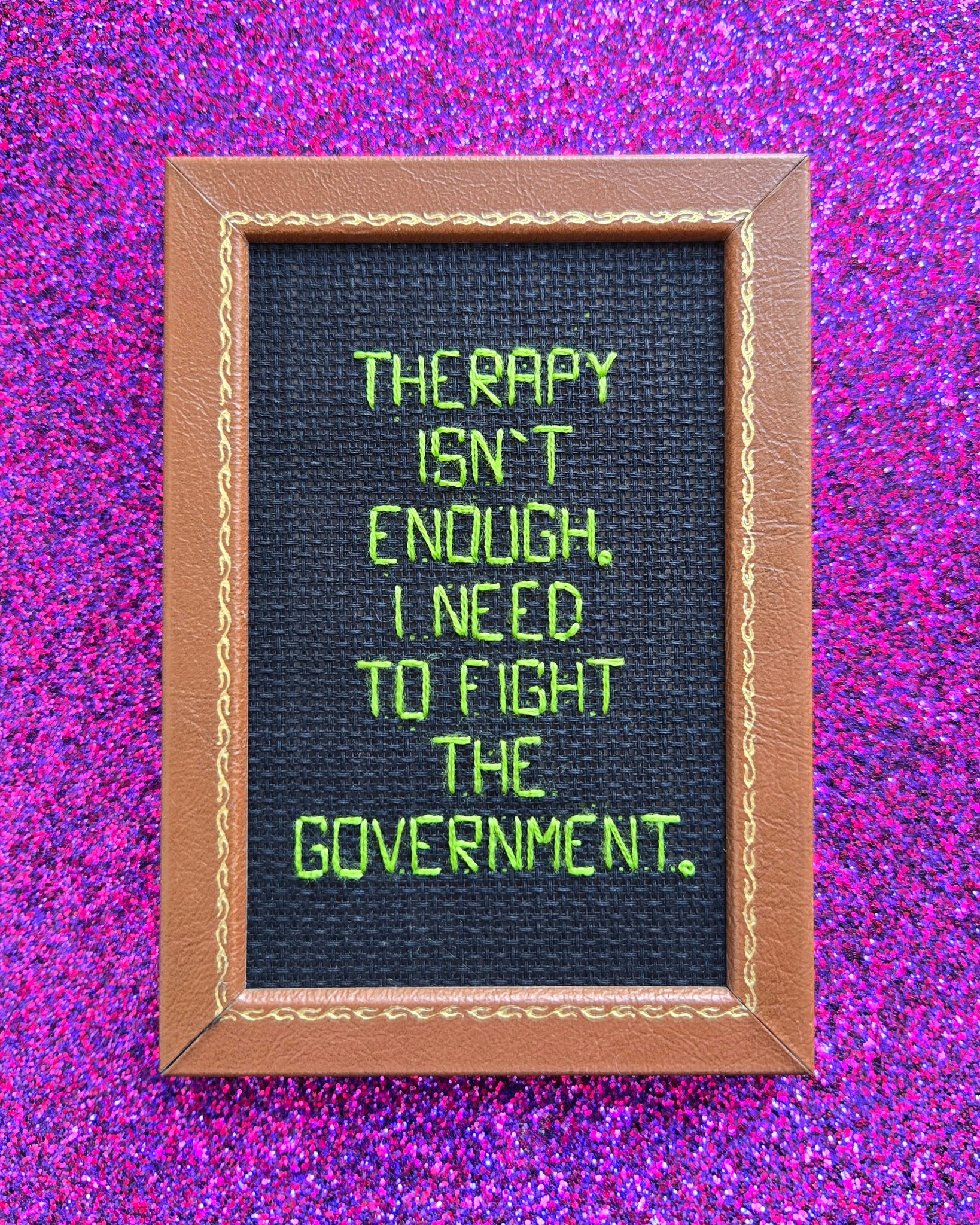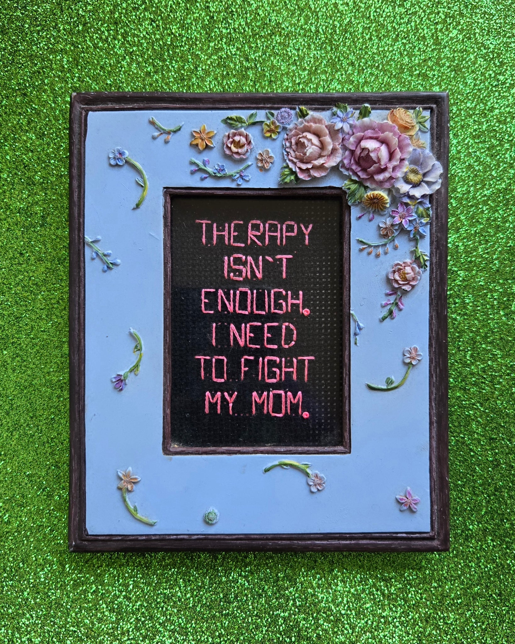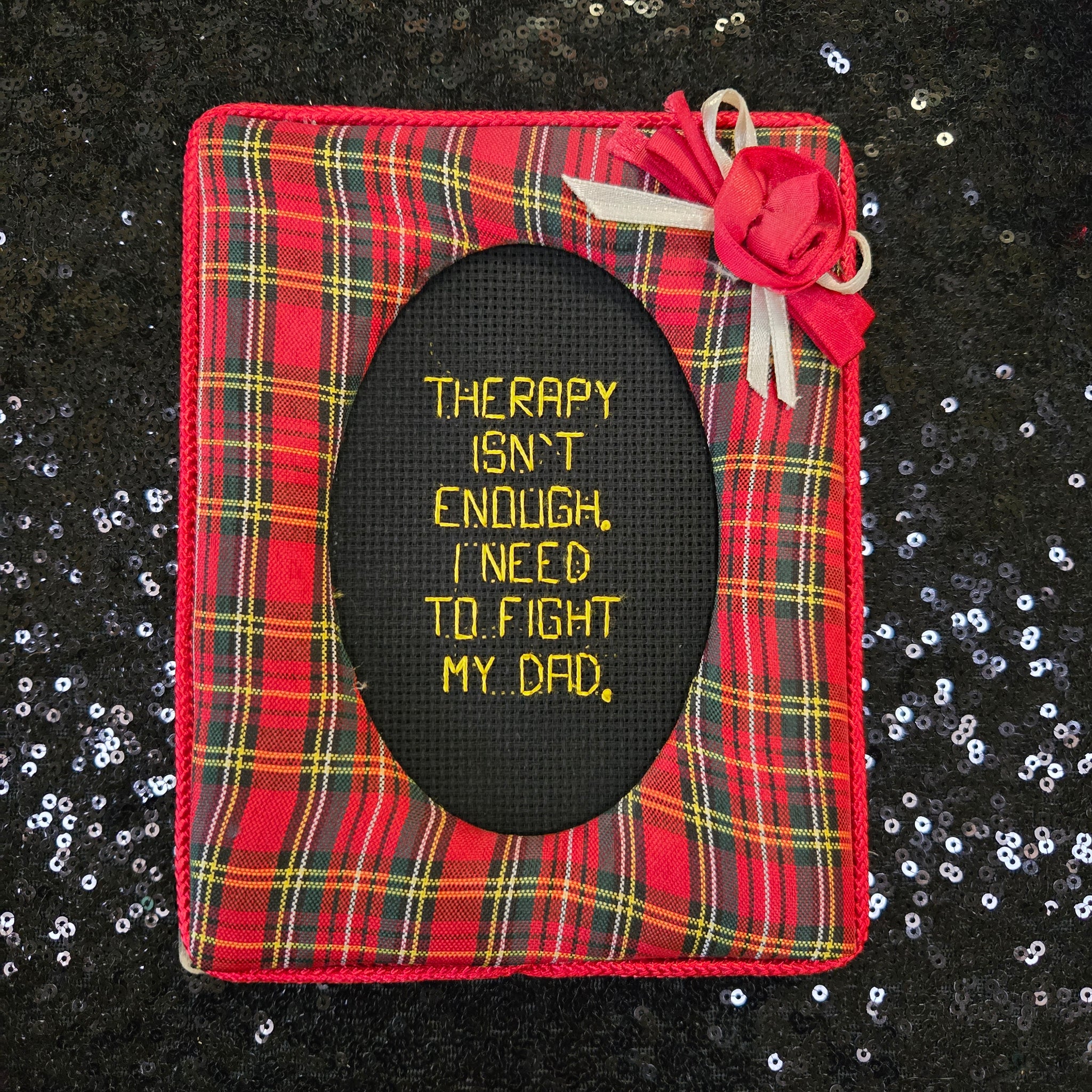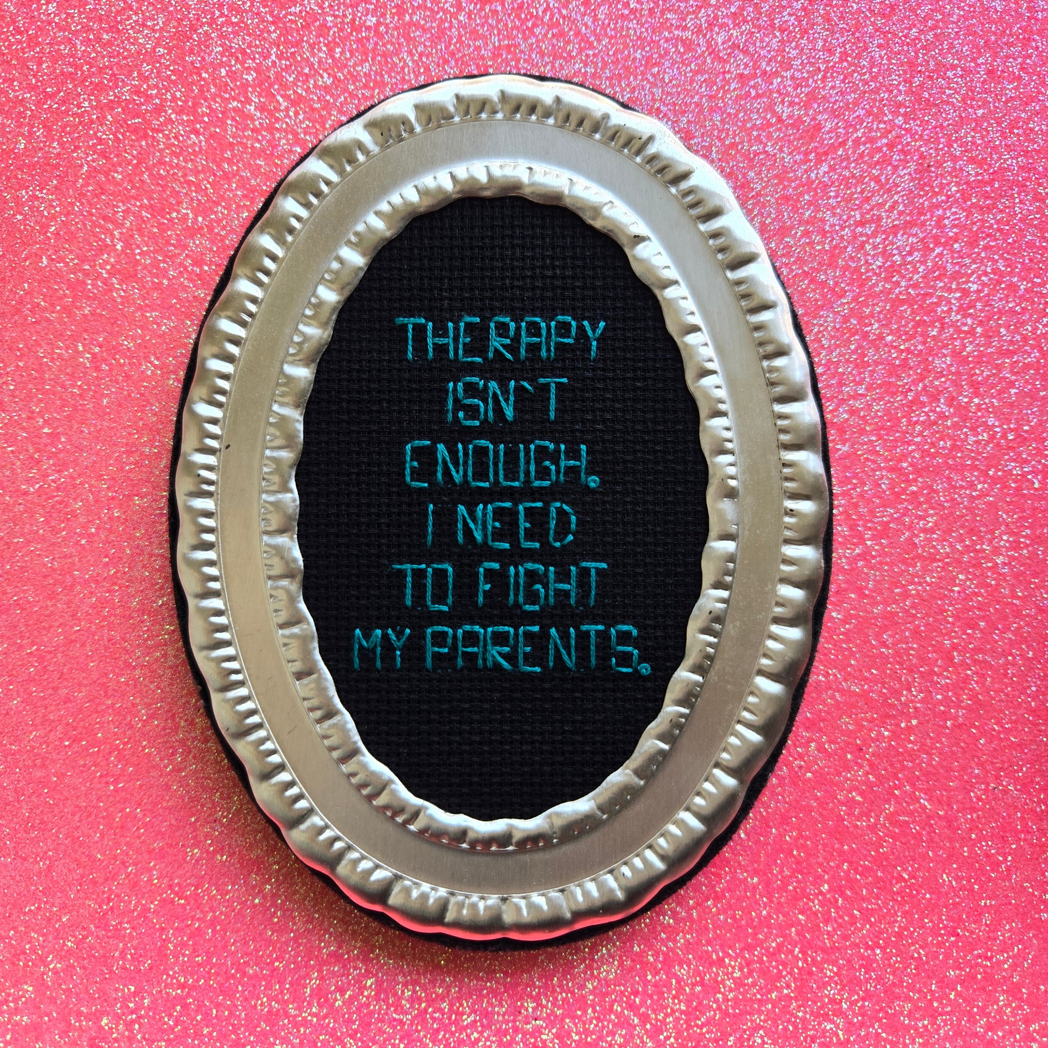 Backstitch on black aida. Held in an oval 5x6in floral frame.