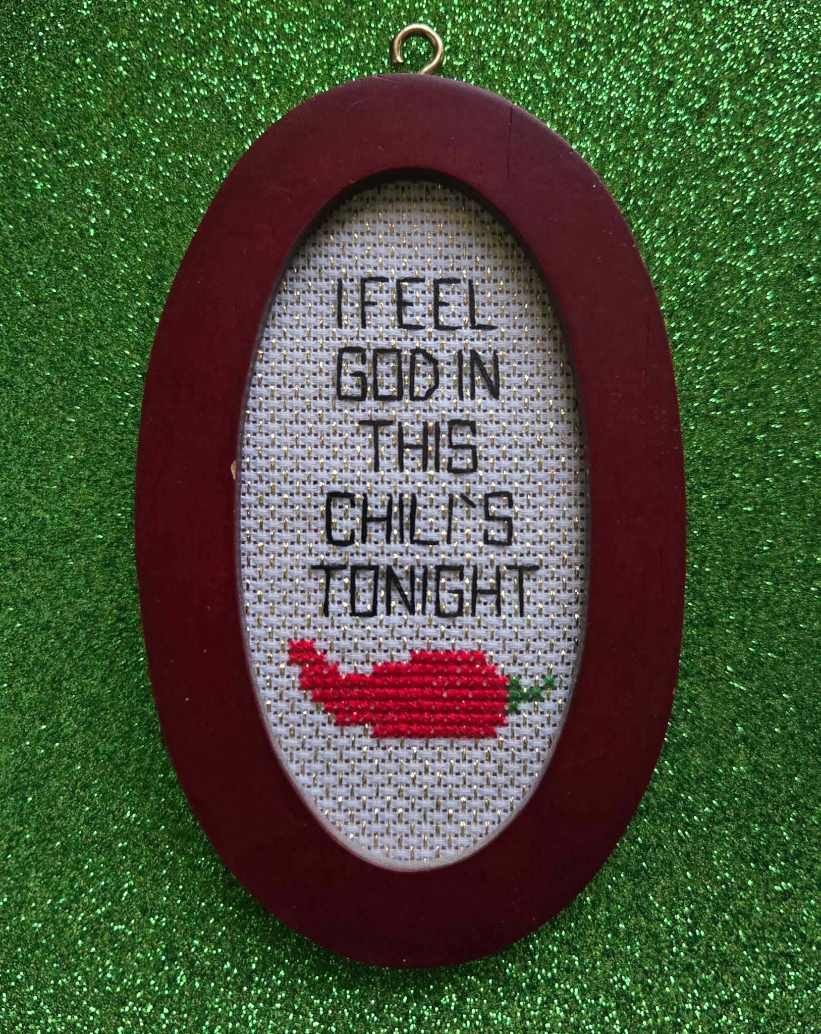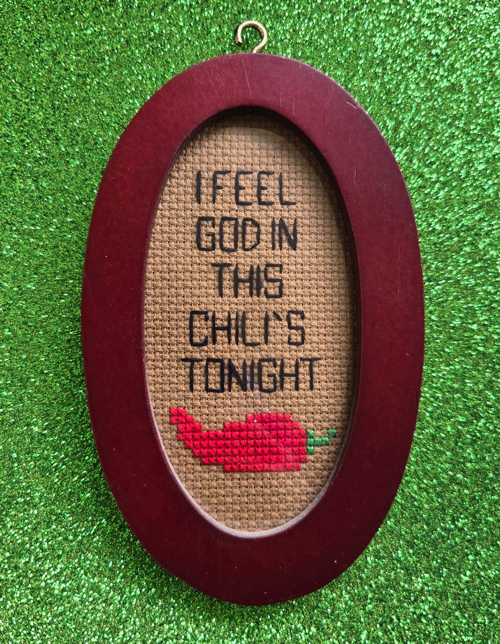 Backstitch and crosstitch on aida. Held in a 3x5in frame.